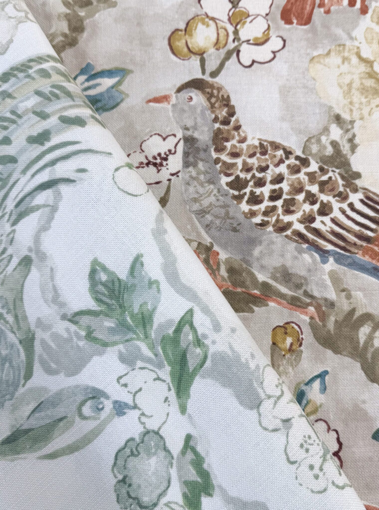 In September’s wallcovering collection “Woodland Walk”, we released two brand new colourways of our much-loved Aviary design: a soft ‘Sea Glass’ which combines fresh greens with opalescent blues and a rich ‘Earth Tones’: this features moss, sand, brick and amethyst for a rich, sophisticated look. For this collection we have matched both new colourways to fabric. Printed on a crisp linen mix, it offers the opportunity to pair the wallpaper with this new fabric.