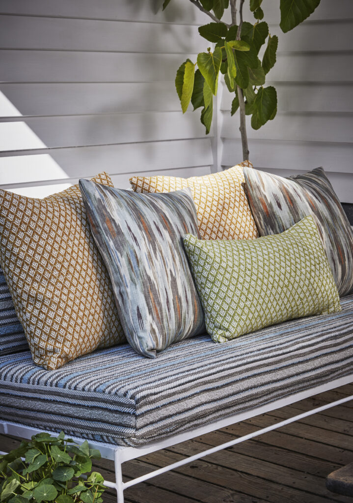 A hand painted characterful Ikat design that has been a long time staple of the Madeaux collection, offering the bold graphic qualities of a contemporary geometric pattern together with the rich textural nature of hand woven textiles. Now available in 100% Outdoor Quality PL on a textured ground with a fabulous handle. The colours are based on the original 01 that combines taupe, duck egg and burnt orange – a gorgeous statement fabric that’s suitable for upholstery both indoors and outside.