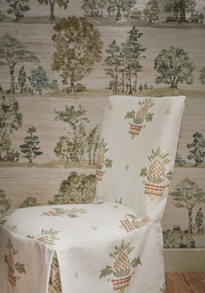 The flagship of the collection is four new floral fabric designs: large scale bouquets of Flower Room, naive stencil-like Pineapple Basket, a graphic trellis inspired by box hedging Knot Garden and an indoor/outdoor weave Leafy Grove. In addition to the new designs we are also introducing new colours of weaves Tiree, Hotchpotch and Covehurst Stripe, an updated outdoor offering of Samarkand, and two new colours of much-loved Aviary.