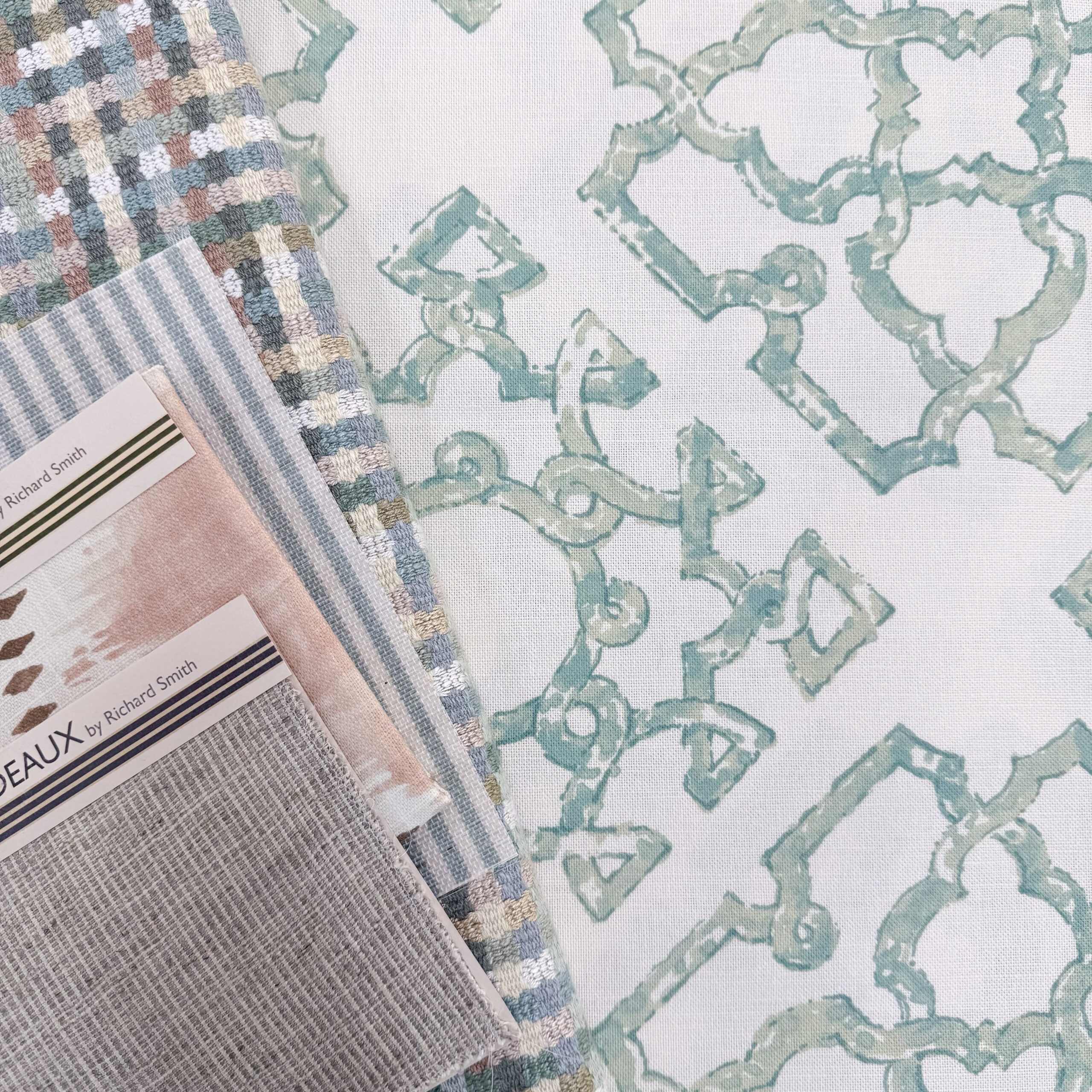 Hotchpotch 03 Seaglass, Audrey Grasscloth 03 Pale Ocean, Pailou 02 Petal and Perdita 02 Duck Egg