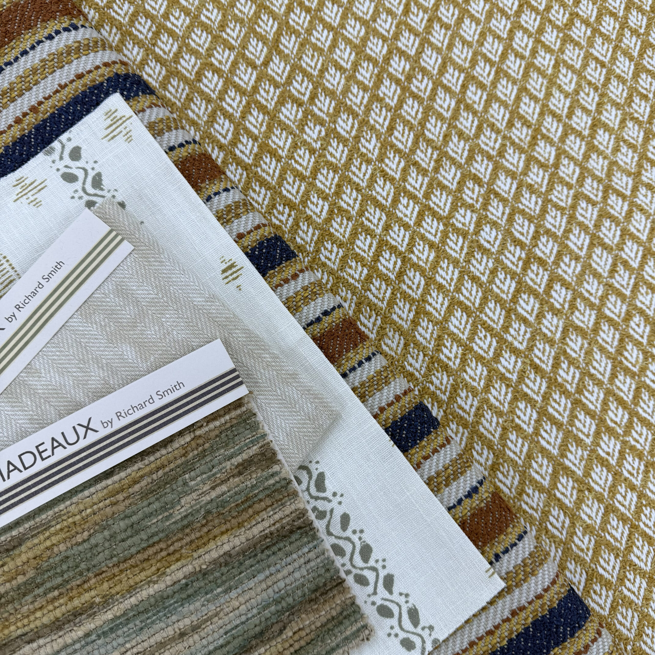 Tiree 01 Ocean Cove, Miranda 01 Mustard, Br没l茅e 01 Vanilla and Ziggery 03 Taupe and Teal