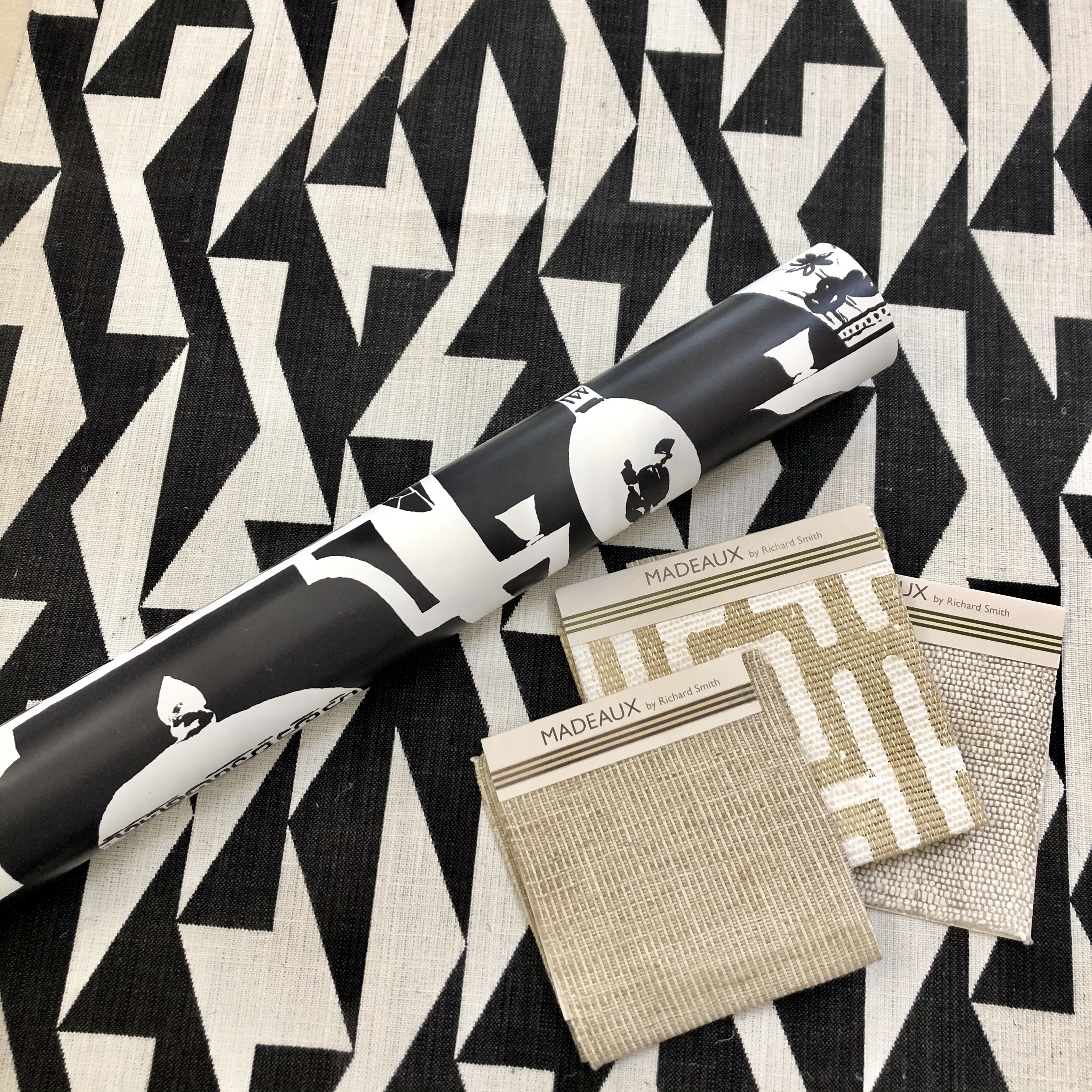 Perdita 03 Honey, Nonsuch 01 Wheat & White, Silk Linen 03 Ecru and Cathay 08 Charcoal Wallpaper